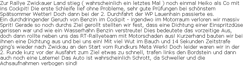 auf die 4. Position zurück! Vor der letzten Wp dem Zuschauerrundkurs lagen wir 7 sec. Hinter
