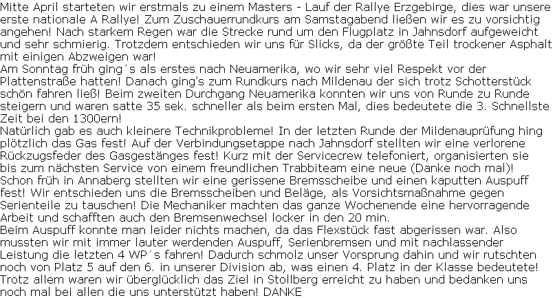 Mit einem 4. Platz kehrten wir von der Rallye rund um Grünhain heim! Bei der starken